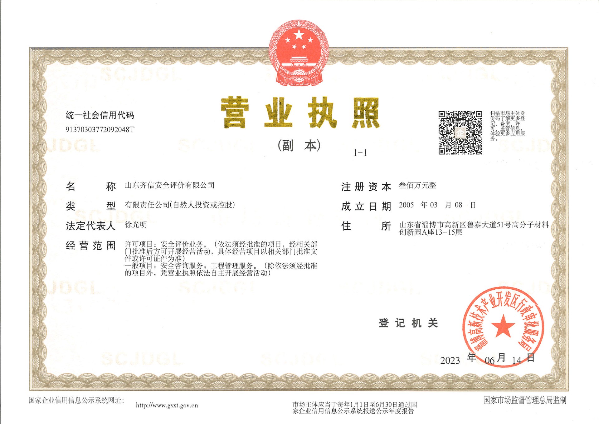 山東齊信安全評價有限公司成立于2005年3月,注冊資本300萬元人民幣,固定資產總值804.8728萬元。法定代表人徐光明,注冊地址及辦公地址位于淄博高新區魯泰大道51號高分子材料創新園A座13-15樓。2005年9月取得安全評價機構乙級資質。自國家應急部1號令實施以來,公司于2020年1月15日取得新安全評價資質,業務范圍包括:陸上油氣管道運輸業;石油加工業,化學原料、化學品及醫藥制造業;金屬冶煉。2018年12月21日取得安全生產標準化二級評審單位,評審范圍:危險化學品、紡織、建材、輕工、冶金、機械。              公司現有人員41人,其中專職安全評價師37人,注冊安全工程師26人,研究員1人、碩士5人、雙學士1人,山東省安全專家庫專家1人、教授級高工1人,高級工程師8人、工程師22人,專職危險化學品標準化評審員、工商貿標準化評審員30人,本科以上學